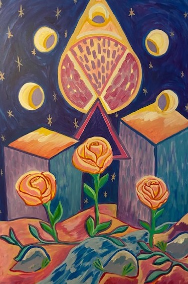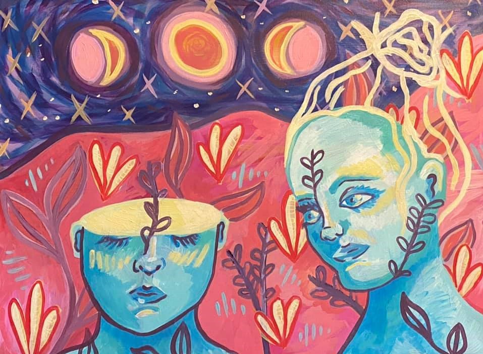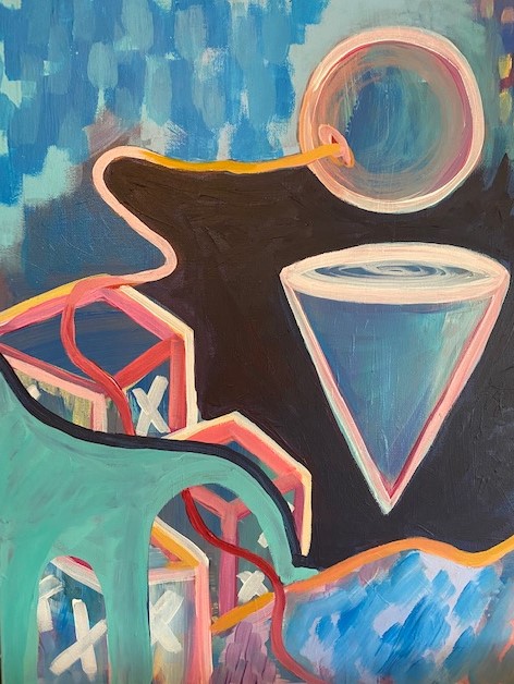 The subject matter for these works is an exploration in whimsical surrealistic atmospheres and portraits, allowing for playful, intuitive creation.